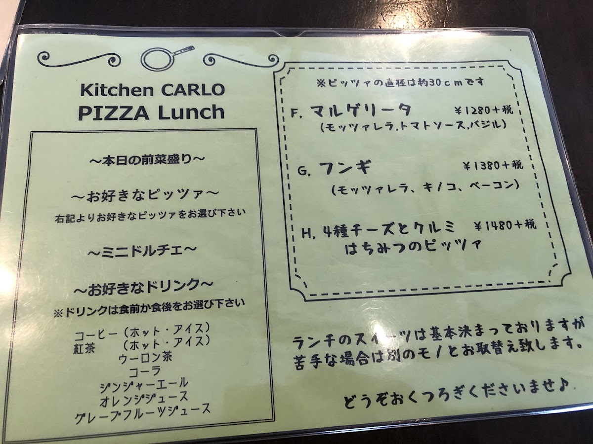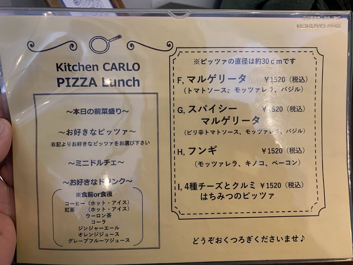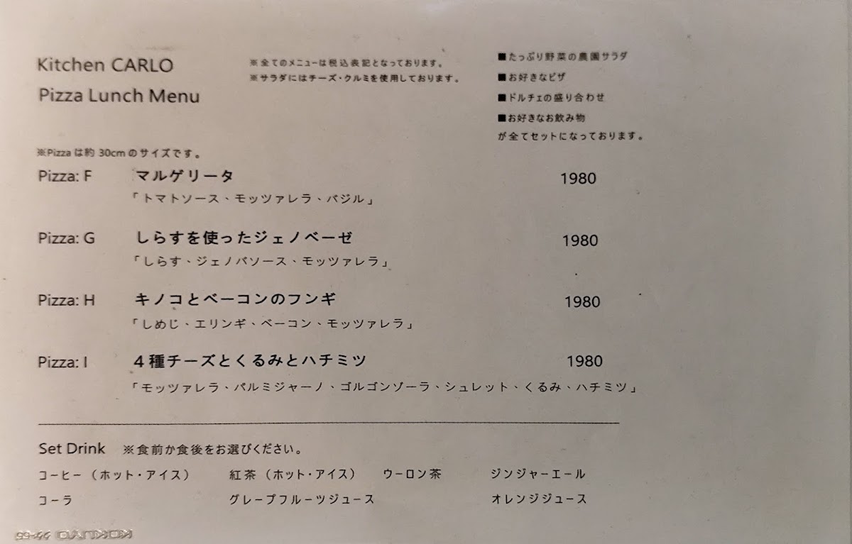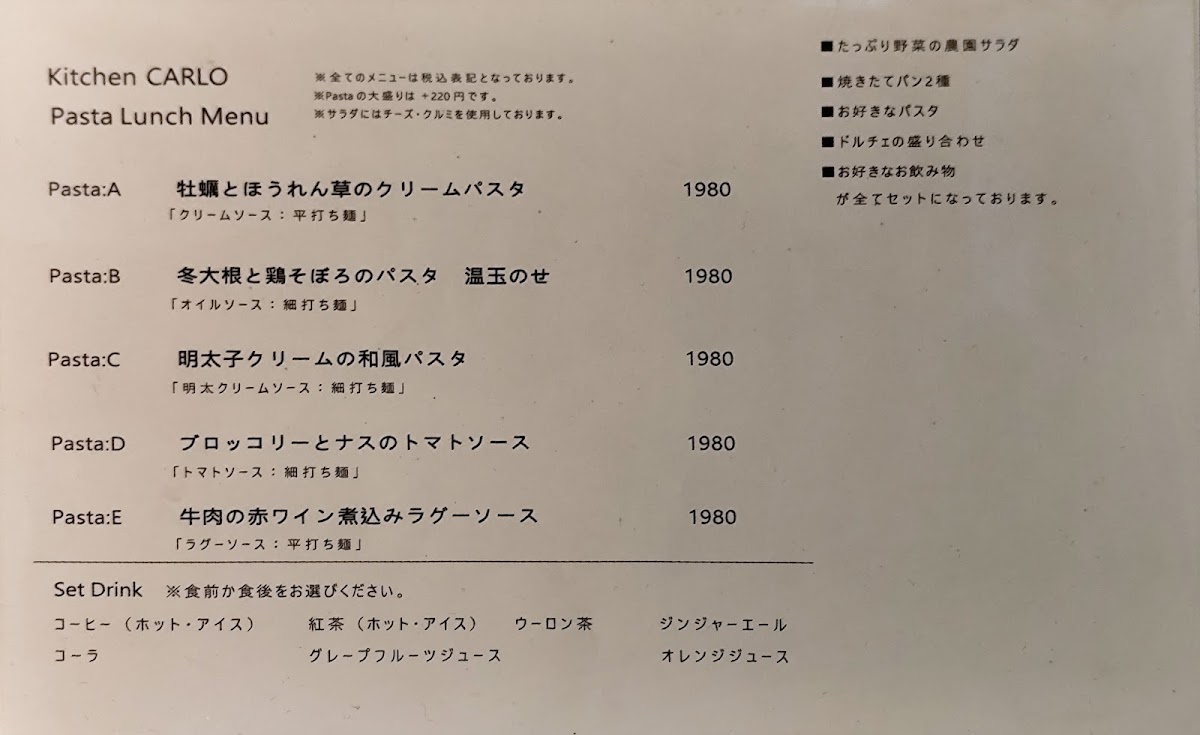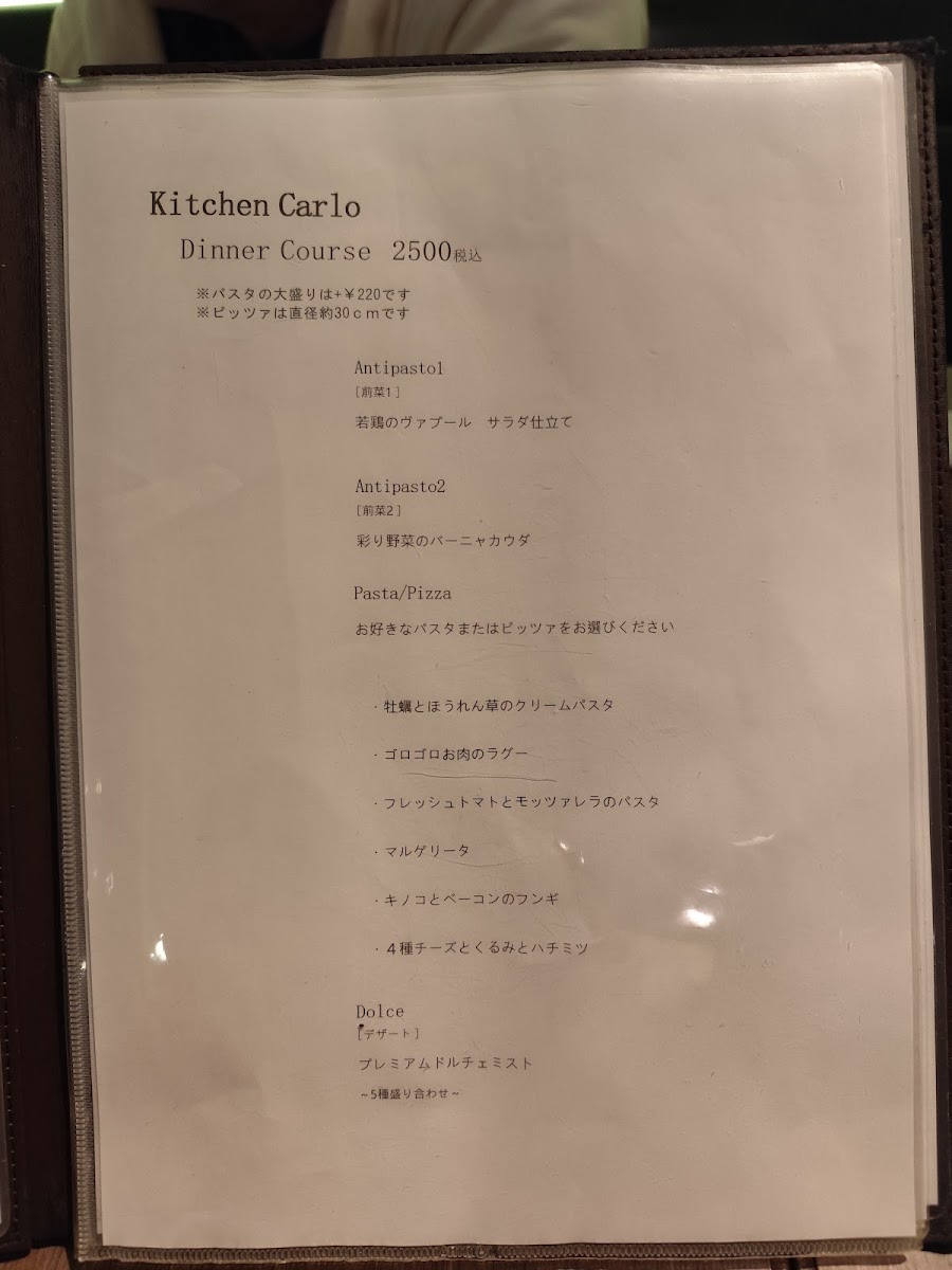 The menu at Kitchen Carlo offers a delightful selection of Italian-inspired dishes, presented in both set lunch options and à la carte choices. For lunch, the Homemade Fresh Pasta Lunch includes a generous portion of Farm Salad with Abundant Vegetables, two types of freshly baked bread, a choice of pasta such as the creamy Yuzu Bonara (with an additional charge of ¥220 for a large portion), a selection of Dolce (desserts), and a drink, all for a satisfying experience. The Napoli Pizza Lunch features a 30cm Margherita Pizza or a rich Four-Cheese and Walnut with Honey Pizza, accompanied by a fresh salad, dessert platter, and drink. For dinner, the Dinner Course priced at ¥2500 offers an appetizer trio, your choice of pasta or pizza, and a dessert, with the option to upgrade pasta to a larger size for an additional ¥220. À la carte, diners can indulge in appetizers like Anchovy Cucumber, pizzas such as Margherita or the sweet and savory Four-Cheese with Walnut and Honey, and hearty pasta like the Eggplant and Bacon Tomato Sauce. For meat lovers, the Grilled Smoked Chicken is a tasty choice, while dessert options include the indulgent Dense Gateau Chocolate. Overall, Kitchen Carlo's menu combines fresh, seasonal ingredients with classic Italian flavors, offering a well-rounded dining experience with great variety.