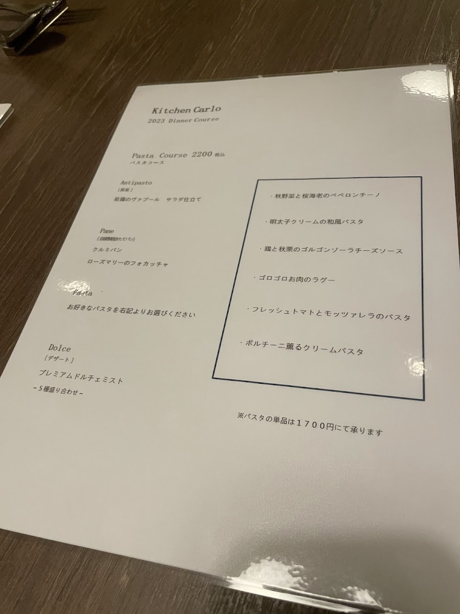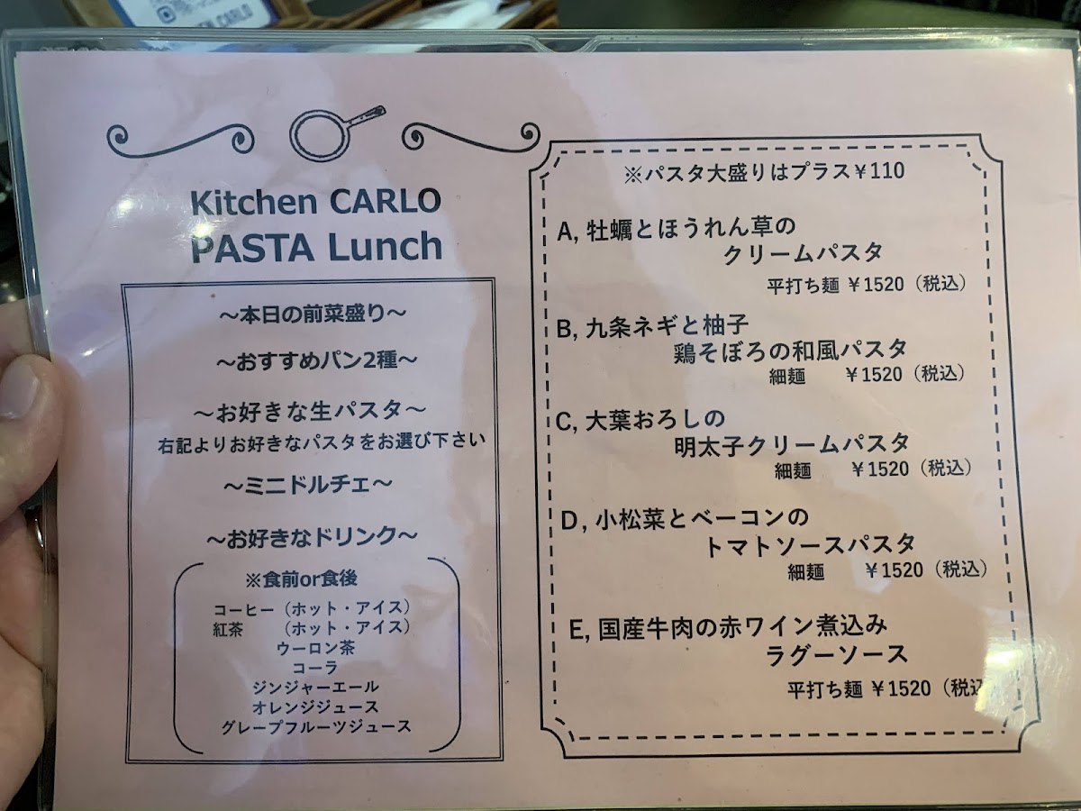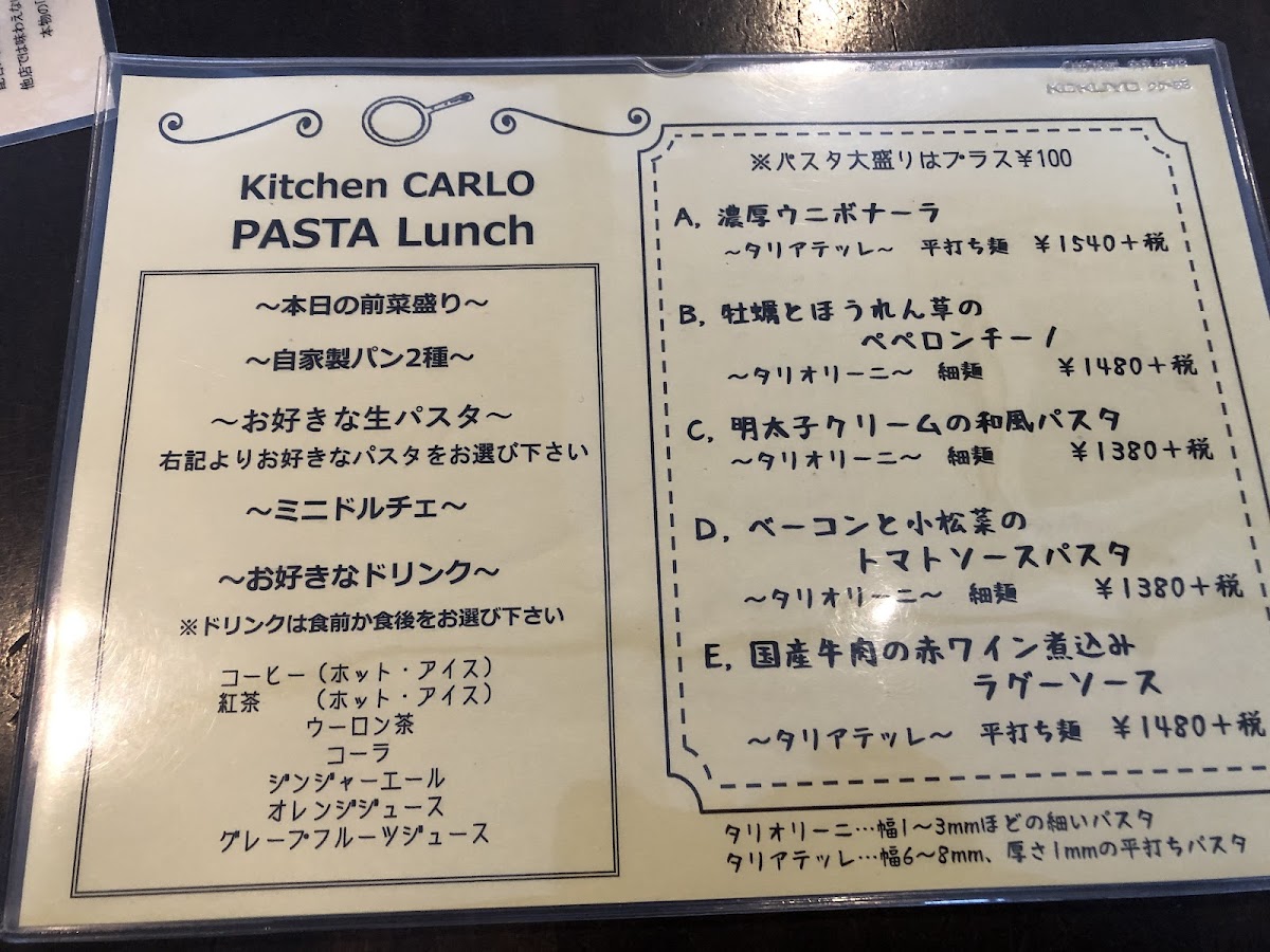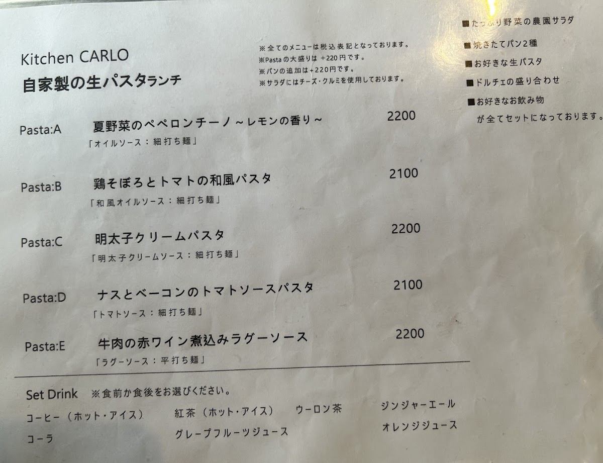 The menu at Kitchen Carlo offers a delightful selection of Italian-inspired dishes, presented in both set lunch options and à la carte choices. For lunch, the Homemade Fresh Pasta Lunch includes a generous portion of Farm Salad with Abundant Vegetables, two types of freshly baked bread, a choice of pasta such as the creamy Yuzu Bonara (with an additional charge of ¥220 for a large portion), a selection of Dolce (desserts), and a drink, all for a satisfying experience. The Napoli Pizza Lunch features a 30cm Margherita Pizza or a rich Four-Cheese and Walnut with Honey Pizza, accompanied by a fresh salad, dessert platter, and drink. For dinner, the Dinner Course priced at ¥2500 offers an appetizer trio, your choice of pasta or pizza, and a dessert, with the option to upgrade pasta to a larger size for an additional ¥220. À la carte, diners can indulge in appetizers like Anchovy Cucumber, pizzas such as Margherita or the sweet and savory Four-Cheese with Walnut and Honey, and hearty pasta like the Eggplant and Bacon Tomato Sauce. For meat lovers, the Grilled Smoked Chicken is a tasty choice, while dessert options include the indulgent Dense Gateau Chocolate. Overall, Kitchen Carlo's menu combines fresh, seasonal ingredients with classic Italian flavors, offering a well-rounded dining experience with great variety.